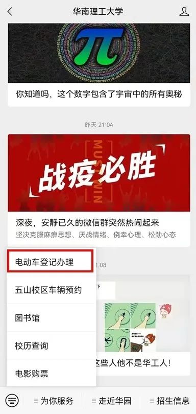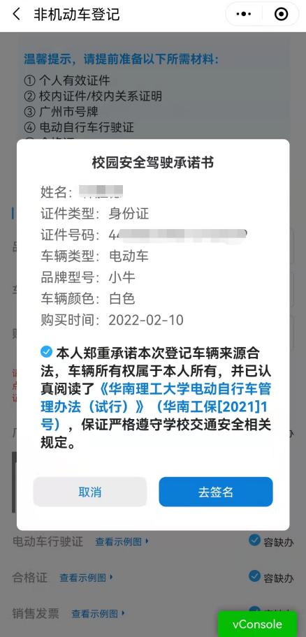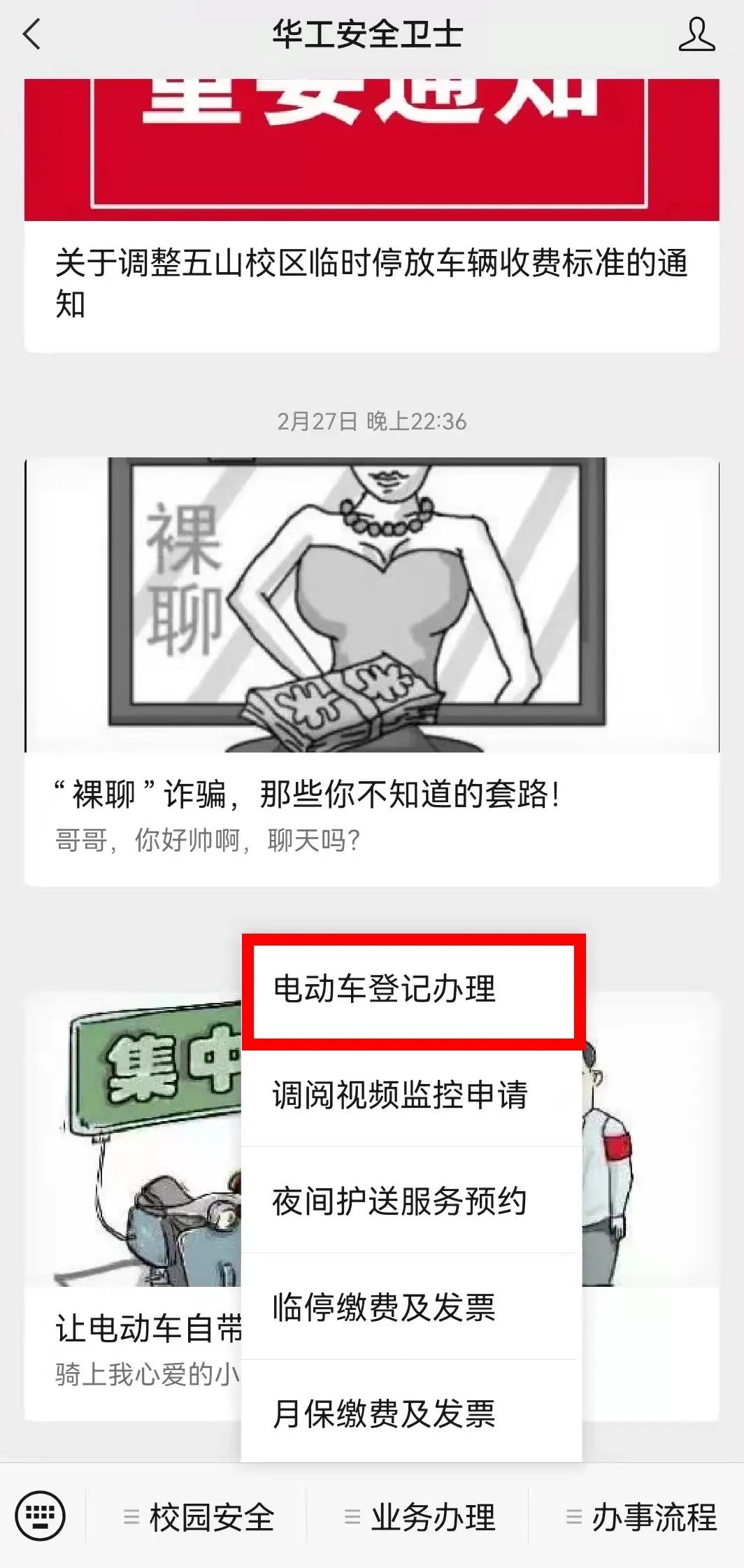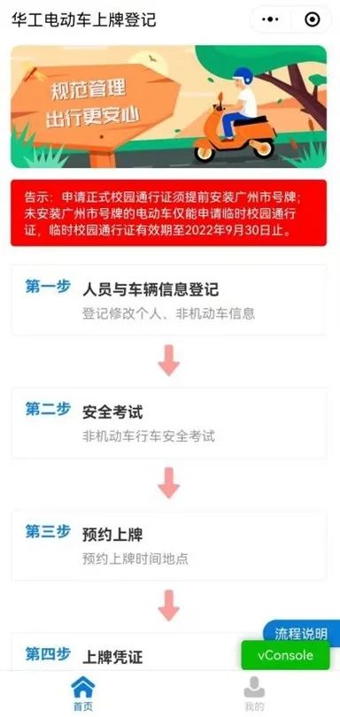 通过“华工电动车管理系统”小程序扫码登记信息及考试,经审核通过后预约校园通行证安装时间及地点;