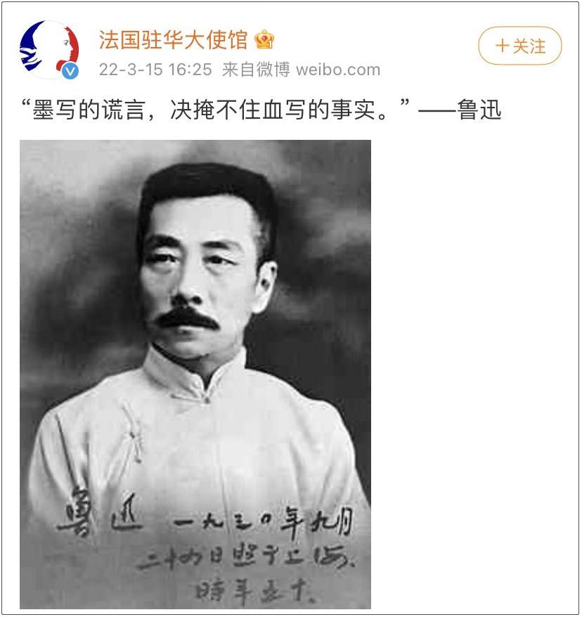 法驻华大使馆官微引用鲁迅名言,翻车了