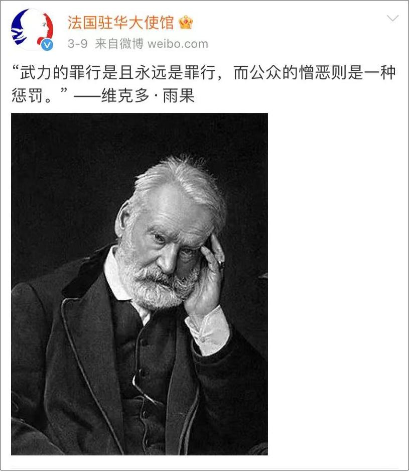 而且在引用名人名言导致评论区翻车这事还有先例,法驻华使馆官微3月9日引用了维克多·雨果的名言来影射乌克兰问题。问题在于大多数中国人对雨果最深的印象,还是“两个来自欧洲的强盗闯进了圆明园......一个叫法兰西,另一个叫英吉利”这句话。