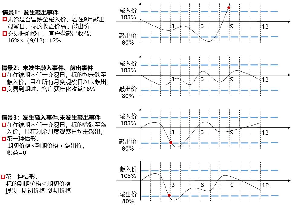 目前,市场上证券公司发行的雪球产品以挂钩中证500指数为主,我们以收益率16%、敲入点位80%、敲出点位103%、1年期的中证500指数雪球产品为例,分析雪球产品的四种损益情形:
