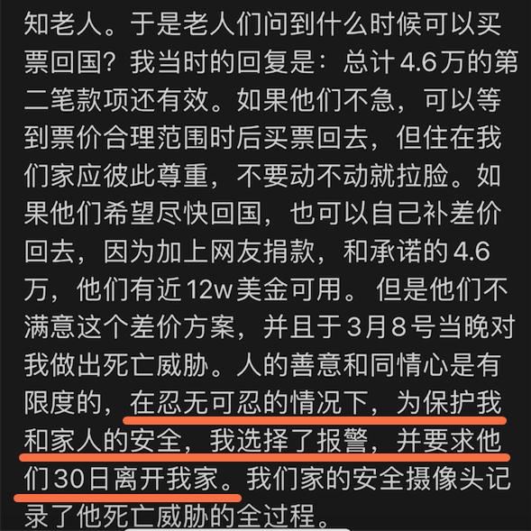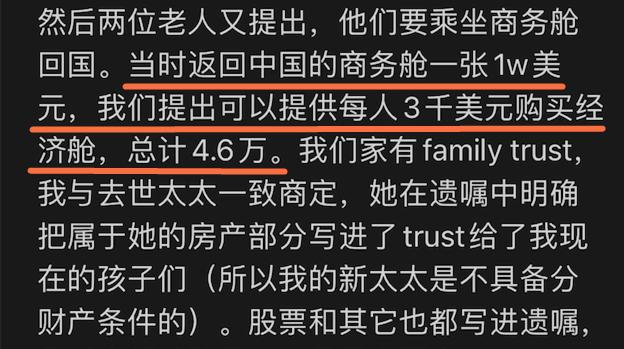 因疫情问题岳父母滞留美国到今年1月份,想要回国但机票价格高涨,男人拒绝给老人们购买全额商务舱机票,表示只愿意给每人出3000美元,剩下的老人由自行承担。