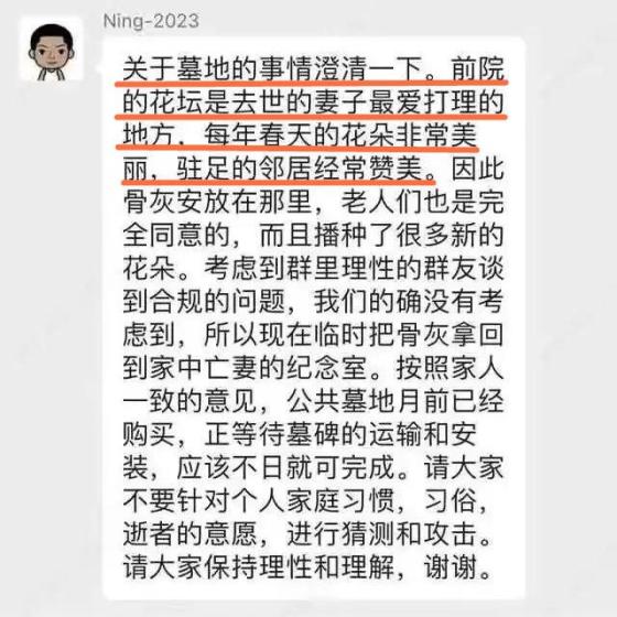 遭到岳父母反对后,男人直接把女人的骨灰埋到了自己家前院,比海葬更省钱。当然理由是冠冕堂皇的,“这是我妻子最爱的地方”。