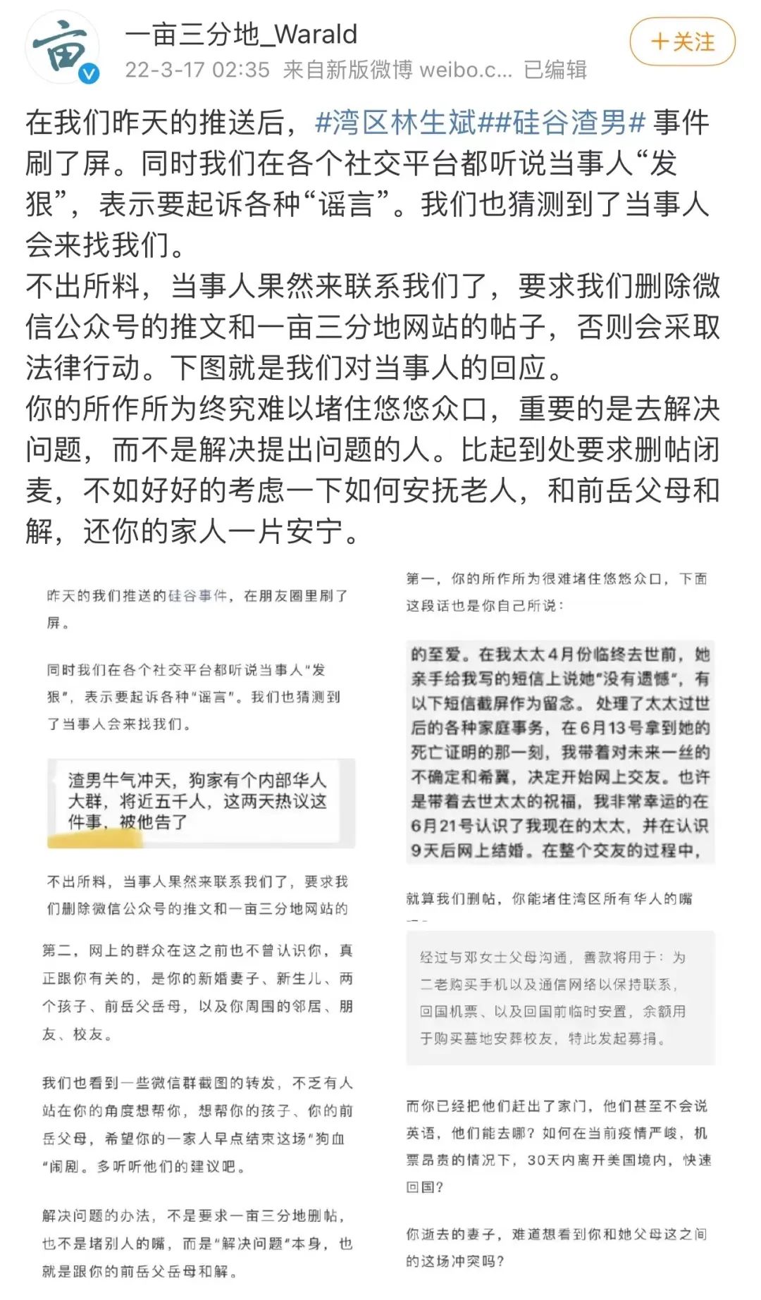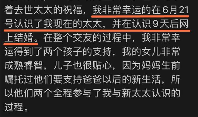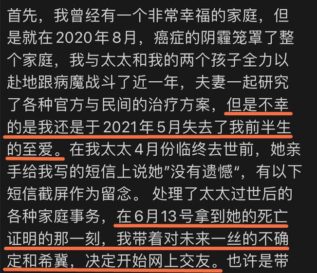 根据他的说法,2021年5月自己失去了此生至爱,6月13日拿到了死亡证明那一刻便开始网上交友——是“此生至爱”呀,不求你守孝三年,但这么快便带着“对未来的一丝不确定性和希冀”去寻求新欢,还是人吗?