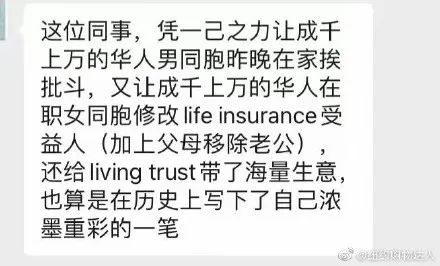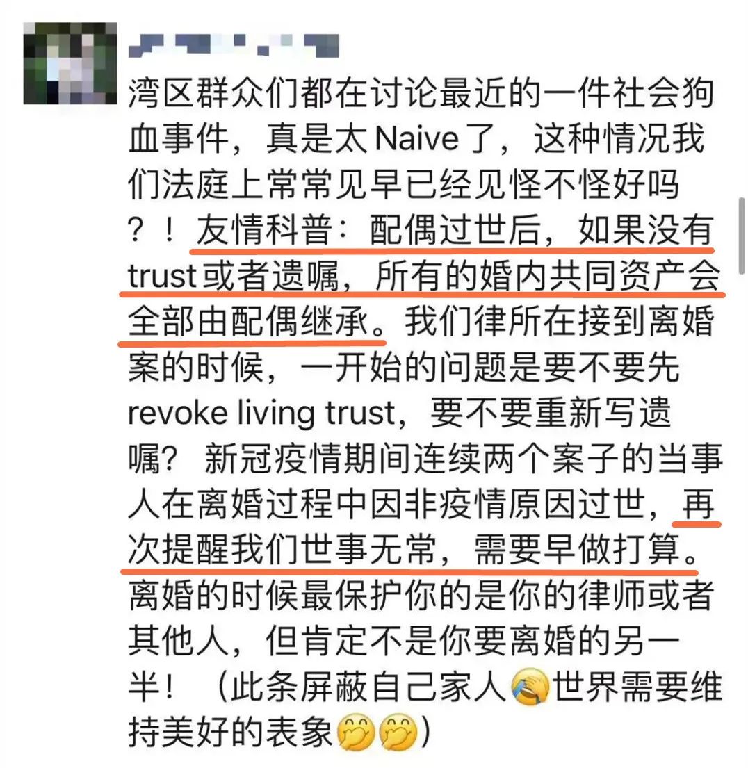 据说这几天到律师处做信托的人超多,多到律师已经约不上了。大家都觉得应该重新审视或者规划一下自己的身后事。另外还炸出来一堆平时不管财务,不知道家庭开支收入,把这些完全都交给老公打理的已婚女性,当甩手掌柜的风险深不可测。