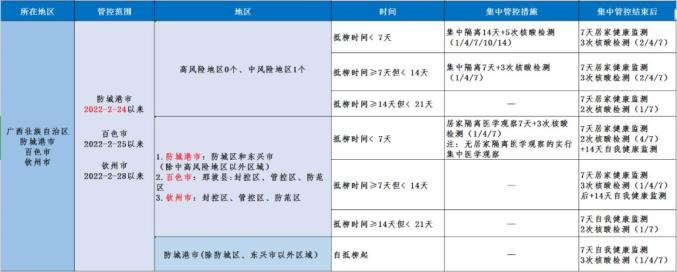 *以上依据自治区疫情防控指挥部办公室桂新冠防指办[2022]16号、桂新冠防指办[2022]25号、桂新冠防指〔2022〕19号及桂新冠防指〔2022〕51号整理,管理措施将根据自治区疫情防控指挥部相关文件要求动态调整,本期内容依据北京日报客户端,截止到2022年3月17日9时整理。近期往返防城港市支援车辆消杀和运输司机的健康管理工作,按照“谁派出,谁负责”的原则,返回后司机进行14天自我健康监测和前3天按照“3天2检”要求开展核酸检测,车辆每次离开或到达目的地后进行一次全面消杀。