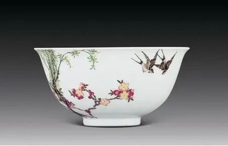 △清乾隆珐琅彩杏林春燕图碗 (来源于网络)粉彩始创于清康熙年间,是在珐琅彩和五彩工艺的基础上发展、演化而来的。早在元代,珐琅工艺由西亚传入中国。这种陶瓷釉上彩绘的技术,最重要的特点是金红、锑黄和含砷的乳浊白料(玻璃白)的运用,并结合中国传统釉上五彩工艺的转变,从而开创性地形成了粉润清秀与俊雅秀美的粉彩瓷器。