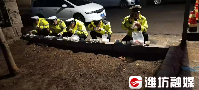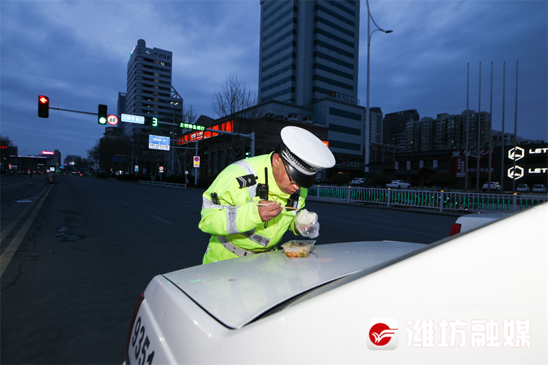 3月17日晚,奎文交警一中队警务人员在东风街一处执勤点进行简单晚餐。