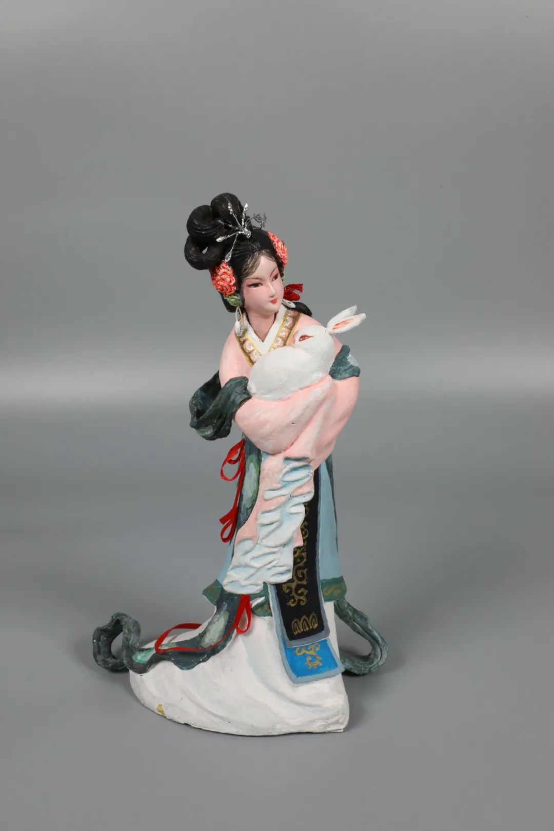 《嫦娥》是潘声煦的代表作品,高约30公分,塑造的嫦娥身着粉色水仙绿叶裙,披金丝薄烟翠绿纱,头上低垂鬓发斜插镶嵌珍珠白玉簪,双手托抱一玉兔,整体色泽淡雅明快,细节丰富,面容、衣褶、发髻均刻画得栩栩如生,是典型的苏作风格的泥塑作品。