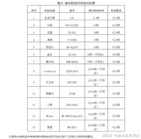 比较测试中,小熊电器一款电水壶(型号:ZDH-A06G1)沸水断电时间为1分31秒,而标准要求则为不超过30秒(≤30秒),不符合QB/T 22089-2008标准要求。