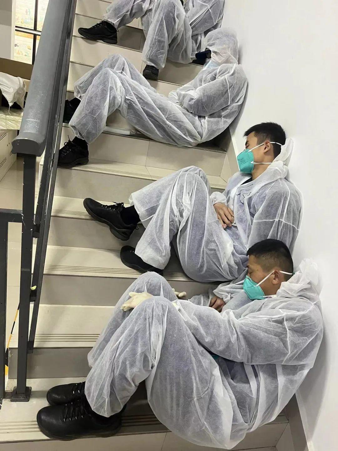 他们不分昼夜,有的晚上10点还在帮助社区搬运防疫物资,有的11点依然忙碌在核酸检测点位维持秩序。凌晨两点,社区的灯还亮着,仍在执勤的队员们实在累了,就轮流坐在楼道里休息一会,有的队员刚坐下就睡着了……不管是在灭火救援的主战场,还是疫情防控的共同阵地,他们一如既往发扬本色,与时间赛跑,守护着这座英雄的城市。