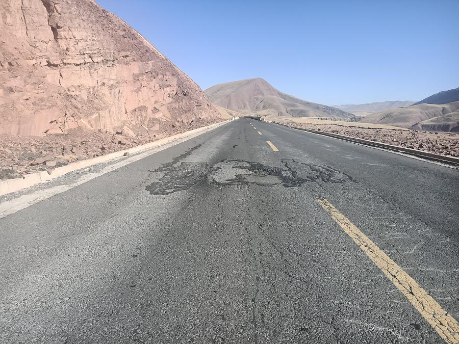 G215国道1715KM+80M处,路面损坏、道路凹陷,请广大驾驶员减速行驶。