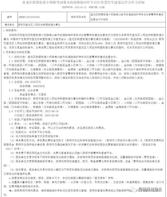 10条市政道路,共计620个临时停车泊位进行运营管理,按照相关要求建设高位视频系统并接入昆明市智慧停车信息系统,相关费用由中标人承担。