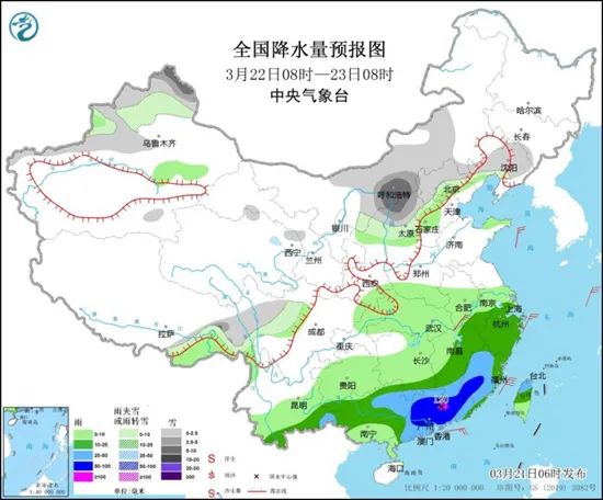 天气3月22日08时至23日08时,内蒙古中部、辽宁北部、新疆西北部、华北北部等地部分地区有小到中雪或雨夹雪,其中,内蒙古中部、新疆西北部、河北北部等地部分地区有大雪。江南中东部和南部、华南大部等地部分地区有中到大雨,其中,福建东南部、广东中部和西北部等地部分地区有暴雨或大暴雨(100~120毫米)。安徽中部部分地区有4~5级风。
