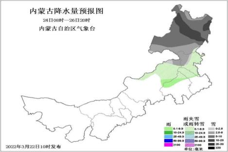 雨雪方面,3月24日8时至26日20时,锡林郭勒盟东部及东部偏北地区有雨雪天气,累计降水量0.1~10毫米;其中,锡林郭勒盟东北部、通辽市北部、兴安盟西部、呼伦贝尔市大部地区有中雪,累计降雪量2.5~4.9毫米;呼伦贝尔市北部、中部和东部有大雪,累计降雪量5.0~9.9毫米;呼伦贝尔市中部、北部和东部部分地区有暴雪,累计降雪量超过10.0毫米;东北部大部地区以雪为主,其余地区以雨夹雪为主。