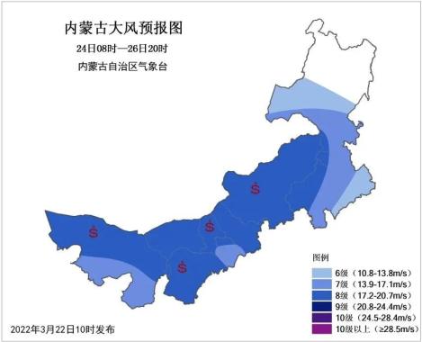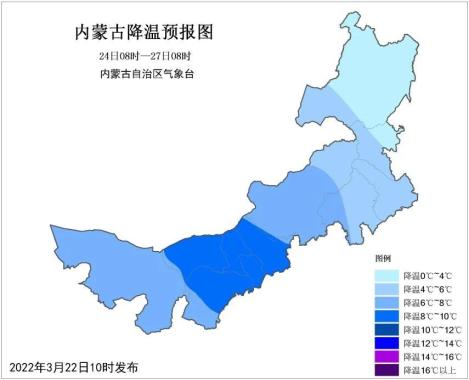降温方面,3月24日8时至27日8时,内蒙古大部气温下降,西中部地区气温下降6~8℃,局部8℃以上,部分地区有寒潮天气。