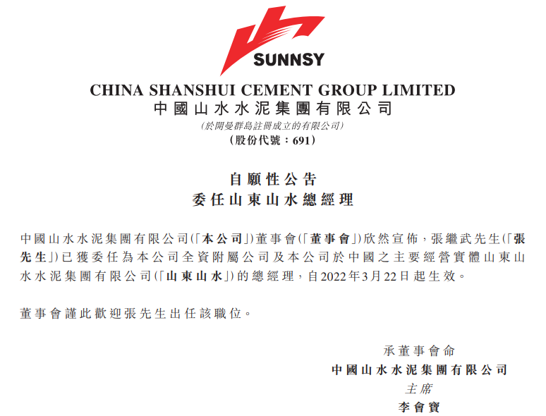 山水水泥(00691.HK)3月22日晚间发布公告,张继武已获委任为公司全资附属公司及本公司于中国之主要经营实体山东山水水泥集团有限公司(“山水集团”)的总经理,自2022年3月22日起生效。