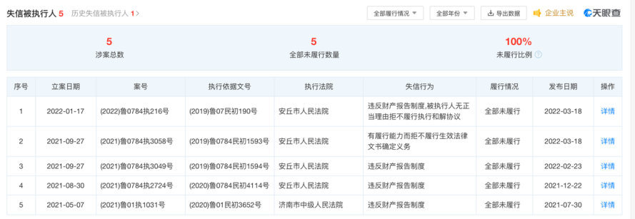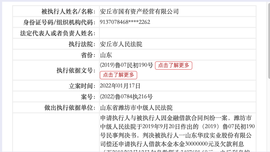 3月18日,中国执行信息公开网公布的信息显示,该案案号为(2022)鲁0784执216号,做出执行依据单位为山东省潍坊市中级人民法院。此次安丘国资经营公司被列为失信被执行人是因为为一项金融借款合同进行连带责任担保所引起。