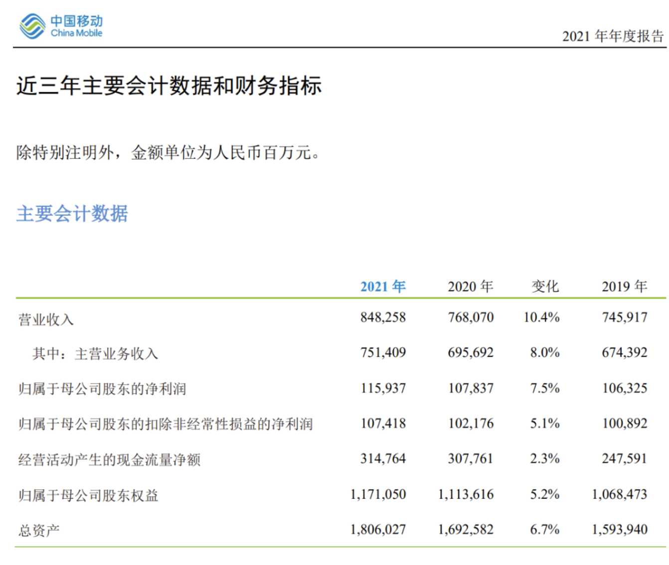 2021年,中国移动实现营业收入8482.58亿元,同比增长10.4%,大大超过2020年的2.97%,创下近年新高。归母净利润为1159.37亿元,同比增长7.5%。
