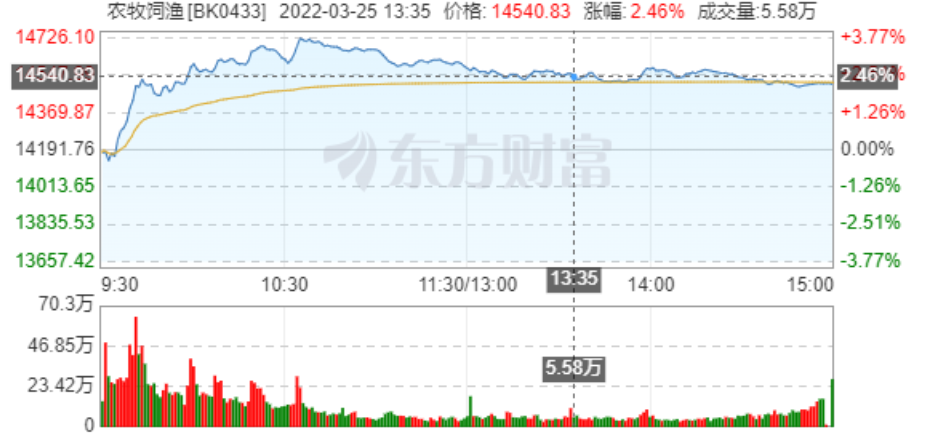 截至3月25日收盘,农牧饲渔板块以2.46%的涨幅稳居行业板块涨幅榜首位。