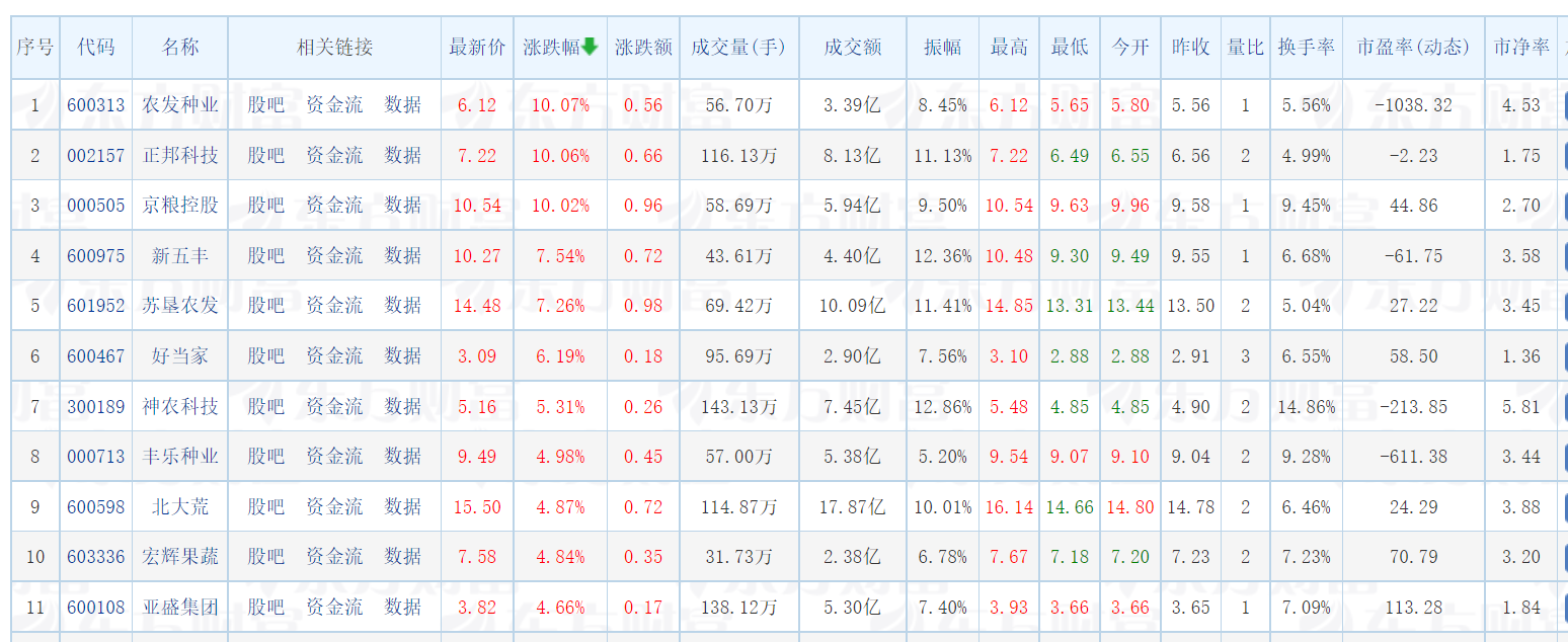 在个股方面,农发种业、正邦科技、京粮控股涨停,新五丰、苏垦农发、好当家、神农科技涨幅均超5%。此外,丰乐种业、北大荒、宏辉果蔬、亚盛集团等多股跟涨。