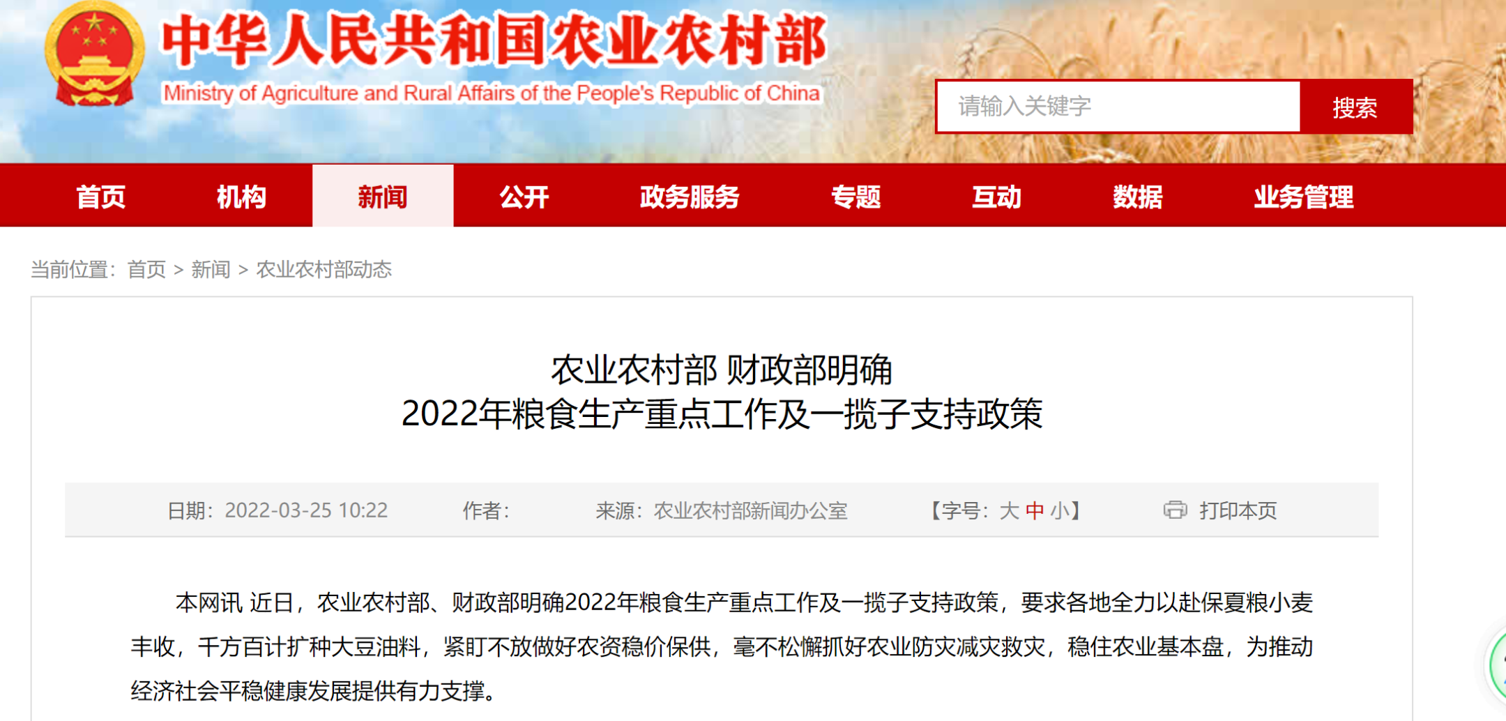 消息面上,近日,农业农村部、财政部明确2022年粮食生产重点工作及一揽子支持政策,要求各地全力以赴保夏粮小麦丰收,千方百计扩种大豆油料,紧盯不放做好农资稳价保供,毫不松懈抓好农业防灾减灾救灾,稳住农业基本盘,为推动经济社会平稳健康发展提供有力支撑。