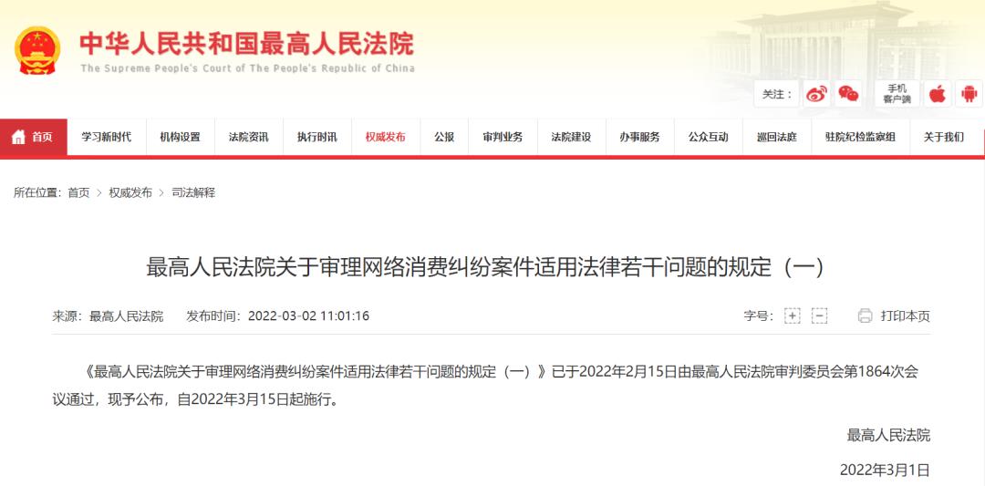 在今年 3 月 2 号的时候,最高人民法院通过了一条《 最高人民法院关于审理网络消费纠纷案件适用法律若干问题的规定( 一 ) 》。