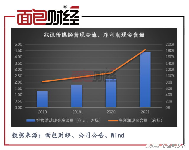 此外,兆讯传媒的获现能力较为优秀。2018年至2021年,公司经营现金流净额持续增加,2021年实现经营活动现金净流入4.41亿元,较2020年翻番。
