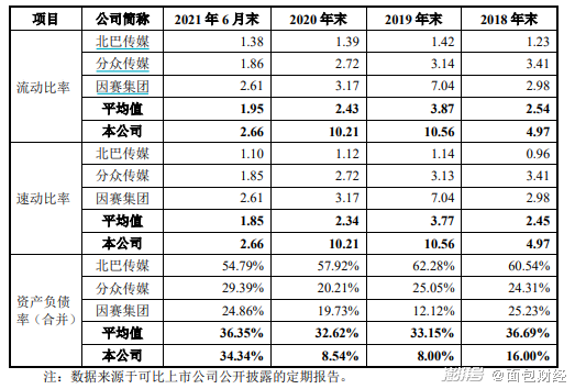 同期,兆讯传媒的净利润现金含量也在持续上升,从2018年的82%一路上升到2021年的183%,利润质量较高。数据显示,兆讯传媒的收现比例相对较高,2018年以来兆讯传媒的销售商品提供劳务收到现金占总营收比例稳定维持在90%以上,这也使得公司能够保持较高的流动性。2018年至2021年上半年,公司的流动比率、速动比率常年超过2.5倍,可比公司的同期指标均低于兆讯传媒。