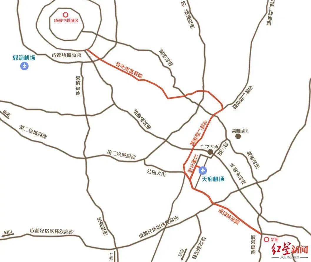 资阳方向:成资快速路-公园大街-五都大道-天府国际机场