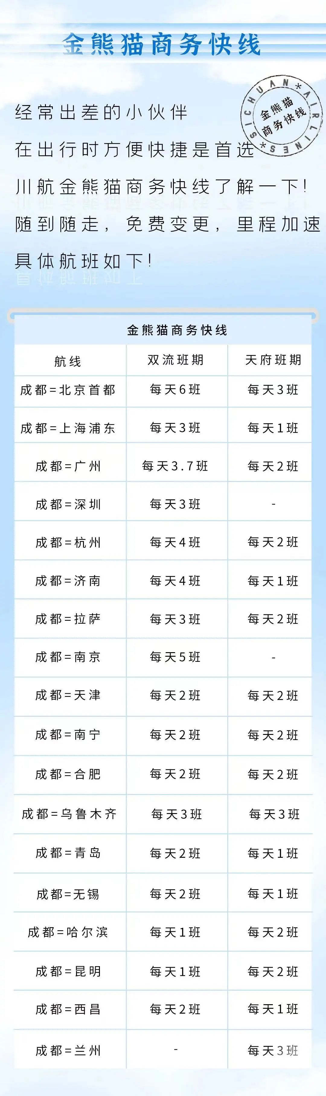 ▲川航天府航线将增至69条为方便公商务旅客出行,此前川航已加密成都双流、天府往返北京、广州、济南、杭州、乌鲁木齐、上海浦东、南京、拉萨的8条航线,每天4班以上。此次换季,川航还将加密成都双流、天府往返深圳、南宁、哈尔滨、昆明、西昌等地航线,共计打造18条金熊猫商务快线。其中,蓉京快线最高可达每天9班,随到随走。值得一提的是,五折以上快线机票在航班起飞4小时前可免费变更至当日该条快线其他航班,会员乘坐快线航班还可获得额外里程奖励。