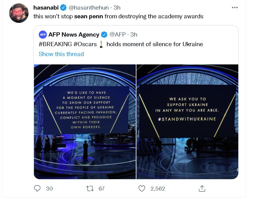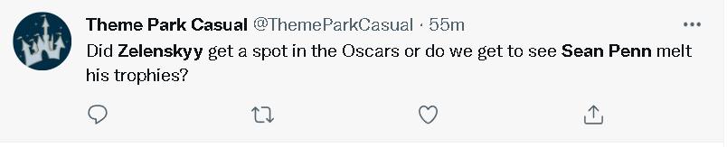 而在他的这番威胁下,在北京时间28日上午——即美国时间27日晚间的奥斯卡颁奖典礼期间,美国乃至世界各地的很多网民,关心的便不再是哪部影片或哪个演员能拿奖了,而是奥斯卡主办方会不会在西恩·潘的这番威胁下,请泽连斯基露面。