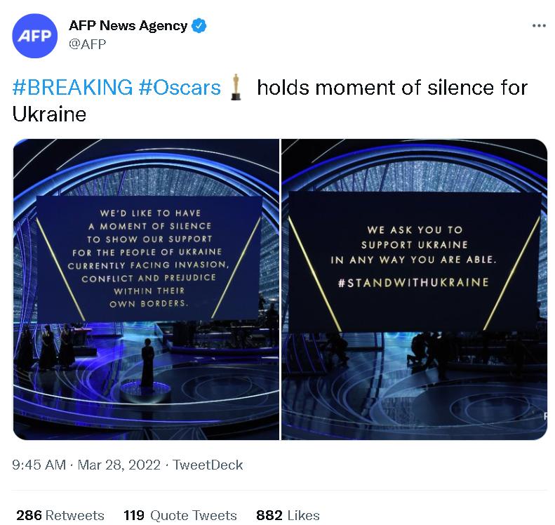 不过,虽然这一美国电影界的颁奖活动吸引了不少国际舆论的关注,但许多人其实并不是出于关心哪部影片会得奖,而是因为在颁奖典礼开始前,曾有一批美国演艺圈的人要求奥斯卡方面在颁奖活动中请乌克兰总统泽连斯基发表讲话。