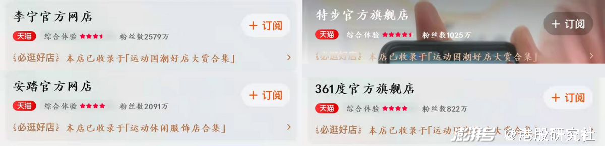在粉丝量方面,截至发稿时间,李宁、安踏、特步、361度的天猫官方网店粉丝量分别为2579万、2091万、1025万、822万。