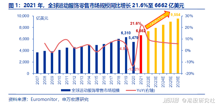 最新发布的Euromonitor数据显示,2021年全球运动服饰零售市场规模达6662亿美元,同比增长22%,绝对规模与相对增速均位居所有服装品类首位。