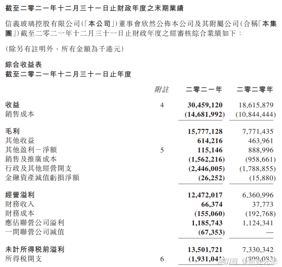 3月17日福耀玻璃公布的2021财年年报显示,营收236亿元人民币,同比增长18.57%,净利润31.5亿元人民币,同比增长20.98%。从营收、利润到增长率都低于此前信义玻璃财报中的数字——营收304亿港元(约合246亿人民币),同比增长63.6%,利润115亿港元(约合93亿人民币)、同比增长79.9%。