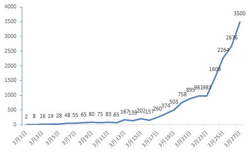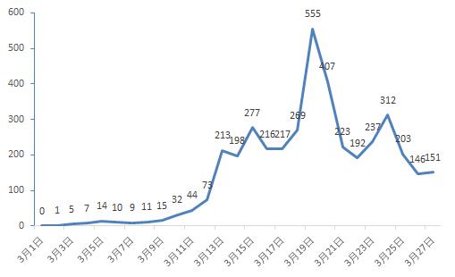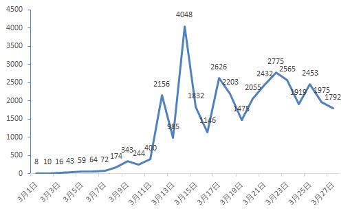 截至3月27日24时,据31个省(自治区、直辖市)和新疆生产建设兵团报告,现有确诊病例27745例(其中重症病例58例),累计治愈出院病例112132例,累计死亡病例4638例,累计报告确诊病例144515例,现有疑似病例19例。累计追踪到密切接触者2236344人,尚在医学观察的密切接触者379771人。