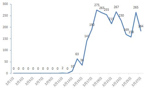 3月27日0—24时,31个省(自治区、直辖市)和新疆生产建设兵团报告新增确诊病例1275例。其中境外输入病例56例(广西14例,四川12例,上海10例,广东6例,吉林4例,浙江3例,福建3例,北京2例,黑龙江1例,河南1例),含15例由无症状感染者转为确诊病例(四川10例,浙江3例,河南1例,广东1例);本土病例1219例(吉林1086例,其中长春市706例、吉林市367例、四平市11例、辽源市1例、松原市1例;上海50例,其中闵行区20例、徐汇区6例、宝山区5例、静安区4例、普陀区4例、浦东新区4例、嘉定区3例、黄浦区2例、虹口区1例、松江区1例;辽宁12例,其中沈阳市5例、葫芦岛市4例、鞍山市2例、营口市1例;黑龙江10例,其中哈尔滨市9例、七台河市1例;福建9例,其中泉州市8例、南平市1例;河南9例,其中周口市8例、漯河市1例;天津8例,其中西青区4例、静海区2例、河西区1例、河北区1例;山东8例,其中泰安市4例、滨州市3例、淄博市1例;河北7例,其中廊坊市3例、唐山市2例、秦皇岛市2例;广东4例,其中肇庆市2例、深圳市1例、东莞市1例;陕西4例,均在安康市;江苏3例,其中泰州市2例、徐州市1例;安徽3例,其中芜湖市1例、淮南市1例、六安市1例;浙江2例,其中嘉兴市1例、台州市1例;江西1例,在南昌市;广西1例,在桂林市;云南1例,在德宏傣族景颇族自治州;甘肃1例,在兰州市),含217例由无症状感染者转为确诊病例(吉林201例,福建4例,陕西4例,山东3例,天津2例,浙江2例,辽宁1例)。无新增死亡病例。新增疑似病例6例,均为境外输入病例(均在上海)。当日新增治愈出院病例1097例,解除医学观察的密切接触者26867人,重症病例较前一日增加5例。