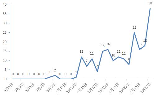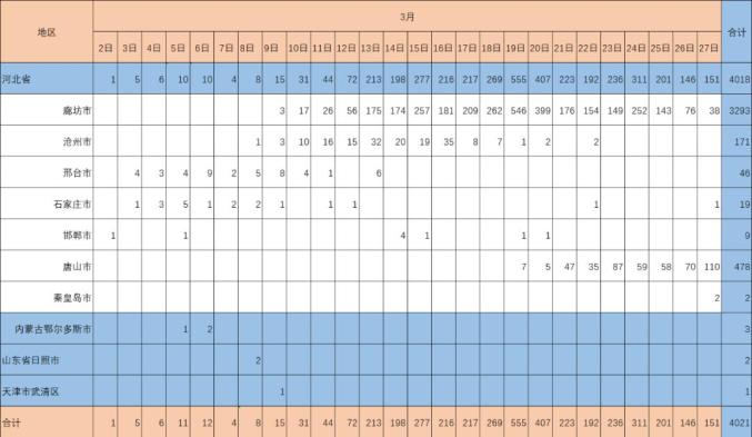 4、河北:3月27日0—24时,河北省新增本土新型冠状病毒肺炎确诊病例7例,其中廊坊市3例、唐山市2例、秦皇岛市2例;新增本土无症状感染者144例,其中唐山市108例、廊坊市35例、石家庄市1例(系外地途经石家庄高速服务区的协查人员)。治愈出院8例,无症状感染者解除医学观察15例。截至3月27日24时,河北省现有本土确诊病例349例;尚在医学观察本土无症状感染者3369例。主要涉及2起疫情,第一为河北廊坊03·08 奥密克戎关联疫情。疫情总体呈下降趋势,需继续严格落实封控区各项防控措施,做好核酸筛查工作,加强隔离点和定点医院感染控制与管理。第二是河北唐山03·19奥密克戎疫情。病例数上升明显,所有感染者均在同一传播链上,疫情涉及多个家庭聚集性疫情和人群密集场所聚集性疫情。社区传播及外溢风险依然较高,需继续严格落实封控管理和全员筛查措施,加强冷链产品供应链条追溯、排查和管控,对风险场所及风险人员进行全面排查、协查和管控,加强集中隔离点和医院防规范感染管理。河北其他传播链疫情。昨日均没有新增感染者报告。需继续加强对外来风险人员的排查和管控。