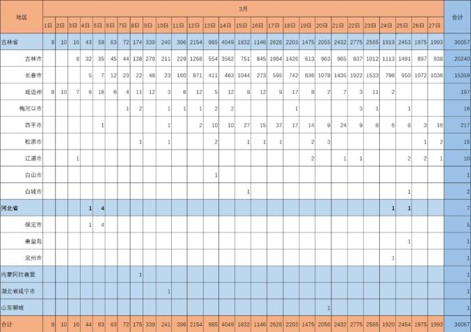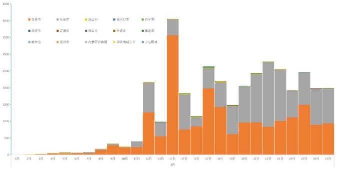 2、吉林:3月27日0-24时,全省新增本地确诊病例1086例(轻型1079例、普通型6例、重型1例),其中长春市706例(含120例无症状感染者转为确诊病例)、吉林市367例(含80例无症状感染者转为确诊病例)、四平市11例、辽源市1例(无症状感染者转为确诊病例)、松原市1例;新增本地无症状感染者907例,其中吉林市571例、长春市330例、四平市5例、松原市1例。以上感染者均已转运至定点医疗机构隔离治疗,对以上人员的密切接触者、次密切接触者均已开展追踪排查,并落实管控措施,对其生活和工作场所进行了终末消毒。吉林省疫情仍然在高位运行,昨天新增继续下降,比26日新增减少183例,疫情仍然以吉林、长春为主,两市封控管控区发现感染者持续高位,近期管控区内发生养老院、市场、工地、大学等多起聚集性疫情,重点单位防控漏洞较大,管控区社区传播未阻断,疫情均依然处于发展阶段。两市需继续提高检测、流调、转运、隔离工作协调联动,提高效率,加快社区感染者发现、转出、隔离救治,控制管控区域内传播;疫情期间养老机构需严格出入管理,坚持核酸筛查,尽快推进加强针接种;医护人员要严格闭环管理,加强医护、采样工作人员和社区志愿者防护培训、健康监测和核酸监测;民生保障企业、方舱援建人员、保供司机等做好个人防护、避免聚集。此外,需继续关注吉林省其他地州疫情进展。