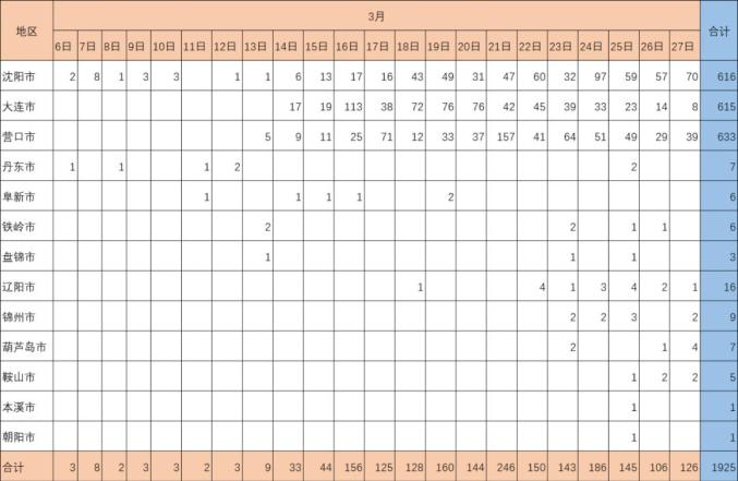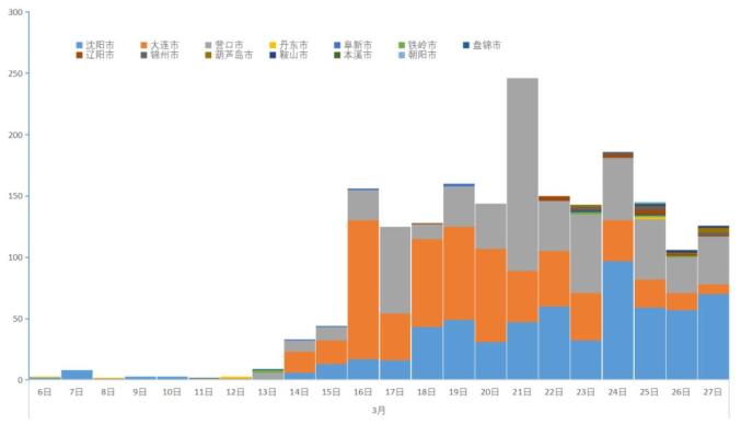 5、辽宁:3月27日0-24时,辽宁省新增12例本土新冠肺炎确诊病例,其中沈阳市报告5例、鞍山市报告2例(含1例由无症状感染者转为确诊病例)、营口市报告1例、葫芦岛市报告4例;新增114例本土无症状感染者,其中沈阳市报告65例、大连市报告8例、锦州市报告2例、营口市报告38例、辽阳市报告1例;新增2例境外输入无症状感染者,为大连市报告。治愈出院本土新冠肺炎确诊病例17例、本土无症状感染者8例;治愈出院境外输入新冠肺炎确诊病例2例、境外输入无症状感染者8例。辽宁省各地需继续加强监测,开展重点人群核酸筛查,及时排查管控来自风险地区人员。营口、沈阳、大连需严格落实封管控措施,尤其是社区内的各项防控措施;沈阳、营口、辽阳需迅速开展流行病学调查和核酸筛查,及时排查和管控风险人群;沈阳、营口需加强流调力量,疫情防控有关工作人员要加强个人防护;阜新、丹东、铁岭、盘锦继续落实各项防控措施,加强对风险人群的排查和管控,巩固防控成果。