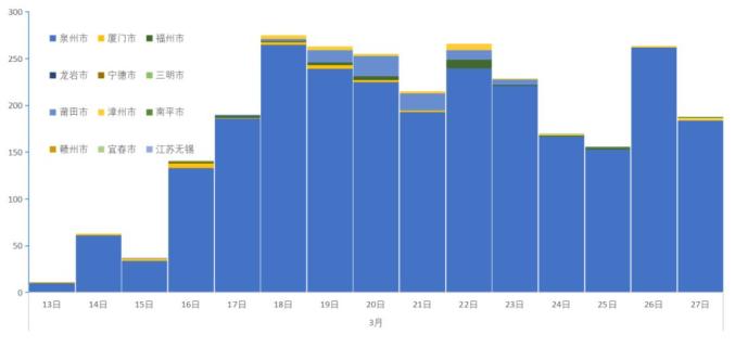 辽宁近期疫情涉及多条传播链,主要新增集中在沈阳和大连沈阳疫情处于快速发展阶段,昨日新增感染数较有明显的降低,但社区传播和外溢风险依然较高。营口、沈阳、大连需严格落实封管控措施,尤其是社区内的防控措施。沈阳、营口、朝阳迅速开展流行病学调查和核酸筛查,及时排查和管控风险人群。8-0313福建泉州疫情
