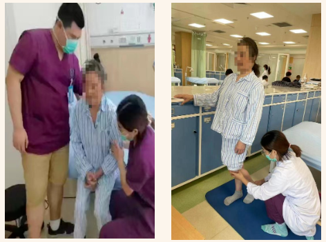 PT:视觉反馈训练调整坐姿站姿(借助姿势矫正镜);促进左侧肢体的本体感觉、坐站及站立时强化左下肢的使用、注意重心的调整,防止健侧过度使用;在患者达到独自坐站,站立平衡2级不充分时,为了实现步行能力,强化本体感觉训练,踏板训练,步行训练,步行中躯干控制、患侧膝控、踝控训练。