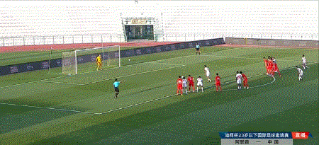 伤停补时阶段,阿联酋队获得任意球机会,门前队员抢点成功,头球破门。
