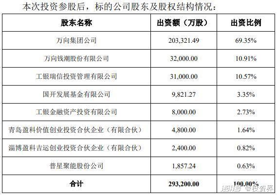 公告显示,本次投资完成后,万向钱潮将持有万向一二三10.91%的股权,为公司第二大股东,仅次于万向集团。在股东列表中,工银瑞信、国开发展基金、工银金融资产、盈科资本等知名机构同样位列其中。