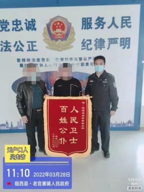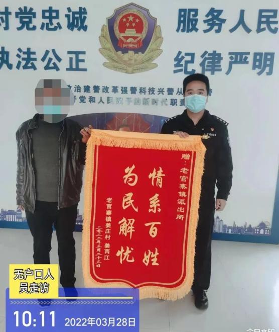 3月28日上午,老人的外孙专程来到老官寨派出所和户政科,将印有“人民卫士 百姓公仆” “一心为民 廉洁奉公”的锦旗送到了民警的手中,感谢民警帮助老人补录户口,解决生活难题。➤ 补录户口解民忧 群众感激送锦旗