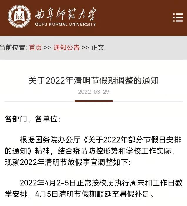 曲阜师范大学:2022年4月2-5日正常按校历执行周末和工作日教学安排,4月5日清明节假期顺延至暑假补足。