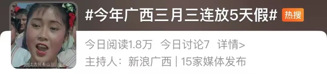 此前,因与清明节放假时间重叠,#广西三月三连放5天假#的消息冲上热搜。