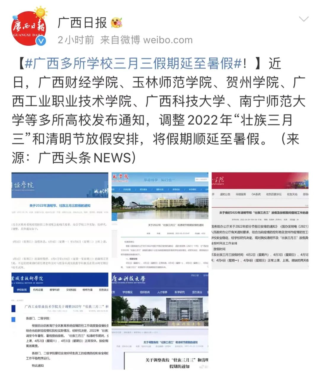 近日,广西多所高校发布通知,调整2022年“壮族三月三”和清明节放假安排,将假期顺延至暑假。