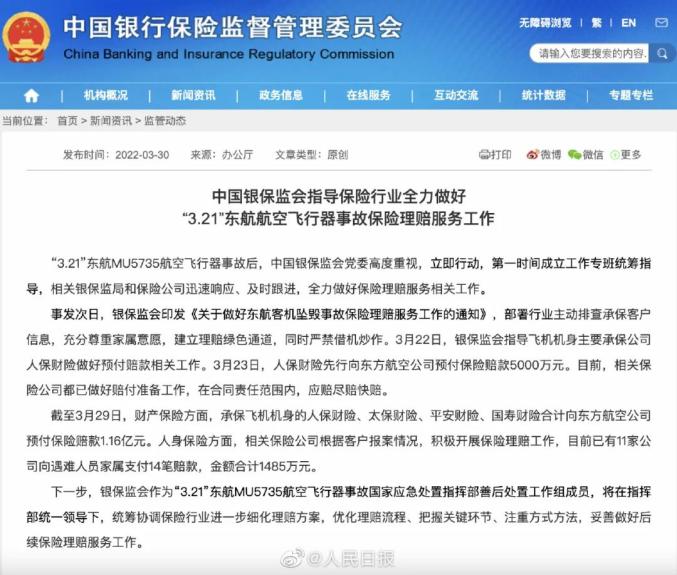 据悉,“3·21”东航MU5735航空飞行器事故次日,银保监会印发《关于做好东航客机坠毁事故保险理赔服务工作的通知》,部署行业主动排查承保客户信息,充分尊重家属意愿,建立理赔绿色通道,同时严禁借机炒作。3月22日,银保监会指导飞机机身主要承保公司人保财险做好预付赔款相关工作。3月23日,人保财险先行向东方航空公司预付保险赔款5000万元。