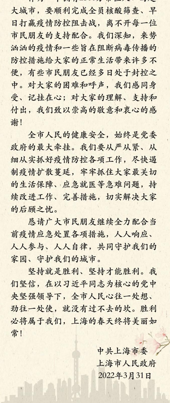 上海市委市政府致信全体市民:感谢理解支持和付出,让我们共同守护家园守护城市